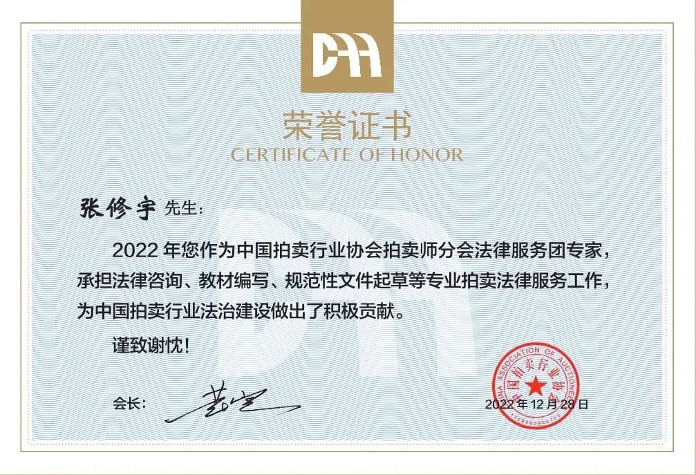 2022年12月28日,中國拍賣行業(yè)協(xié)會為河北如意山海拍賣有限公司總經(jīng)理張修宇頒發(fā)了《榮譽證書》,表彰張修宇對中國拍賣行業(yè)協(xié)會法治建設做出的積極貢獻。